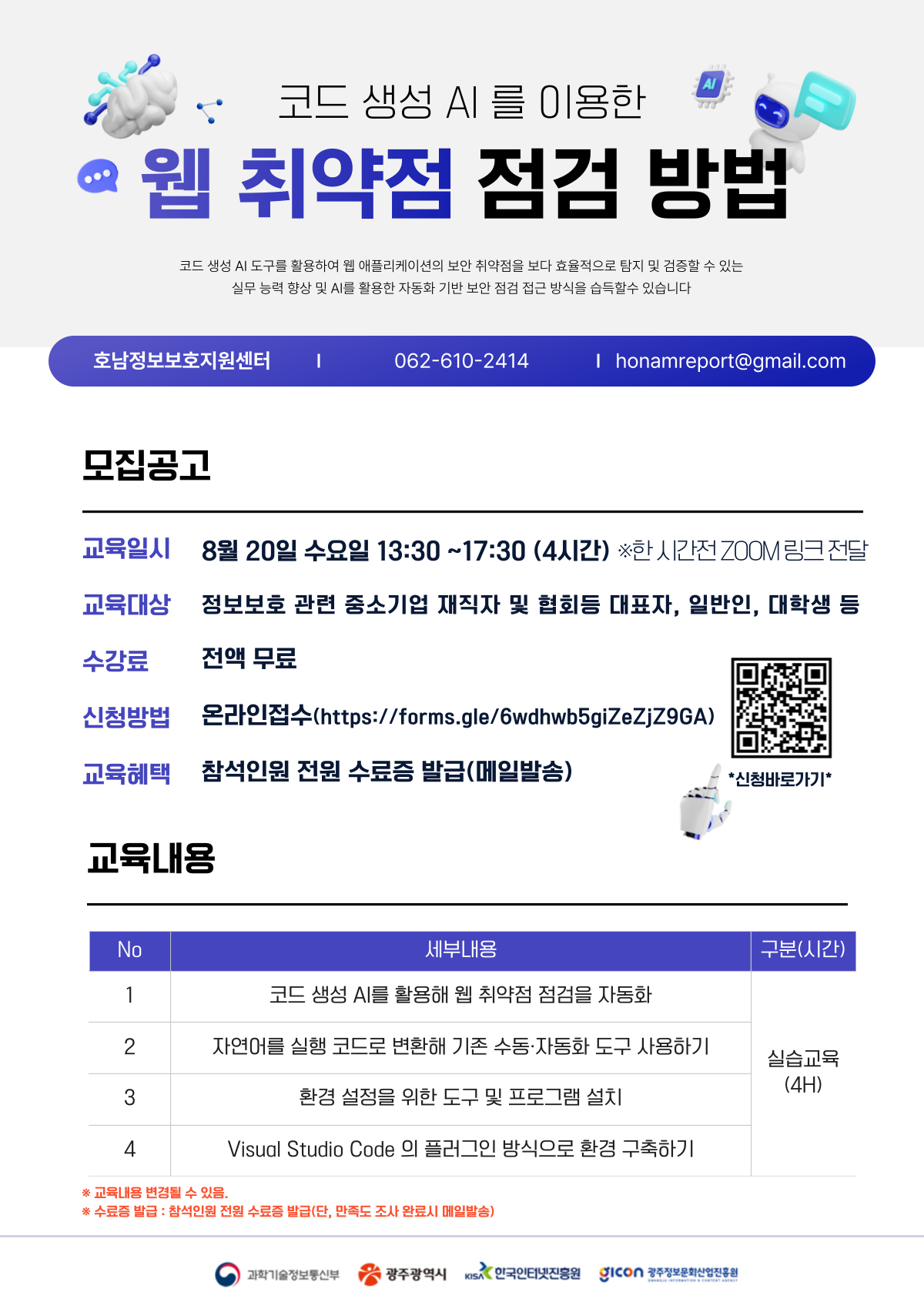 공지사항 [교육홍보] 8.20. 코드 생성 AI를 이용한 웹 취약점 점검 방법 작성 관리자 2025-08-19 조회 428 첨부파일 웹취약점 점검방법_홍보물_20250818.png 이전글 [교육홍보] 8.21. 코드 생성 AI를 이용한 웹 취약점 점검 방법 다음글 「지역 우수 ICT기업 x 수도권 개발자 네트워킹」참여기업 모집 안내 목록