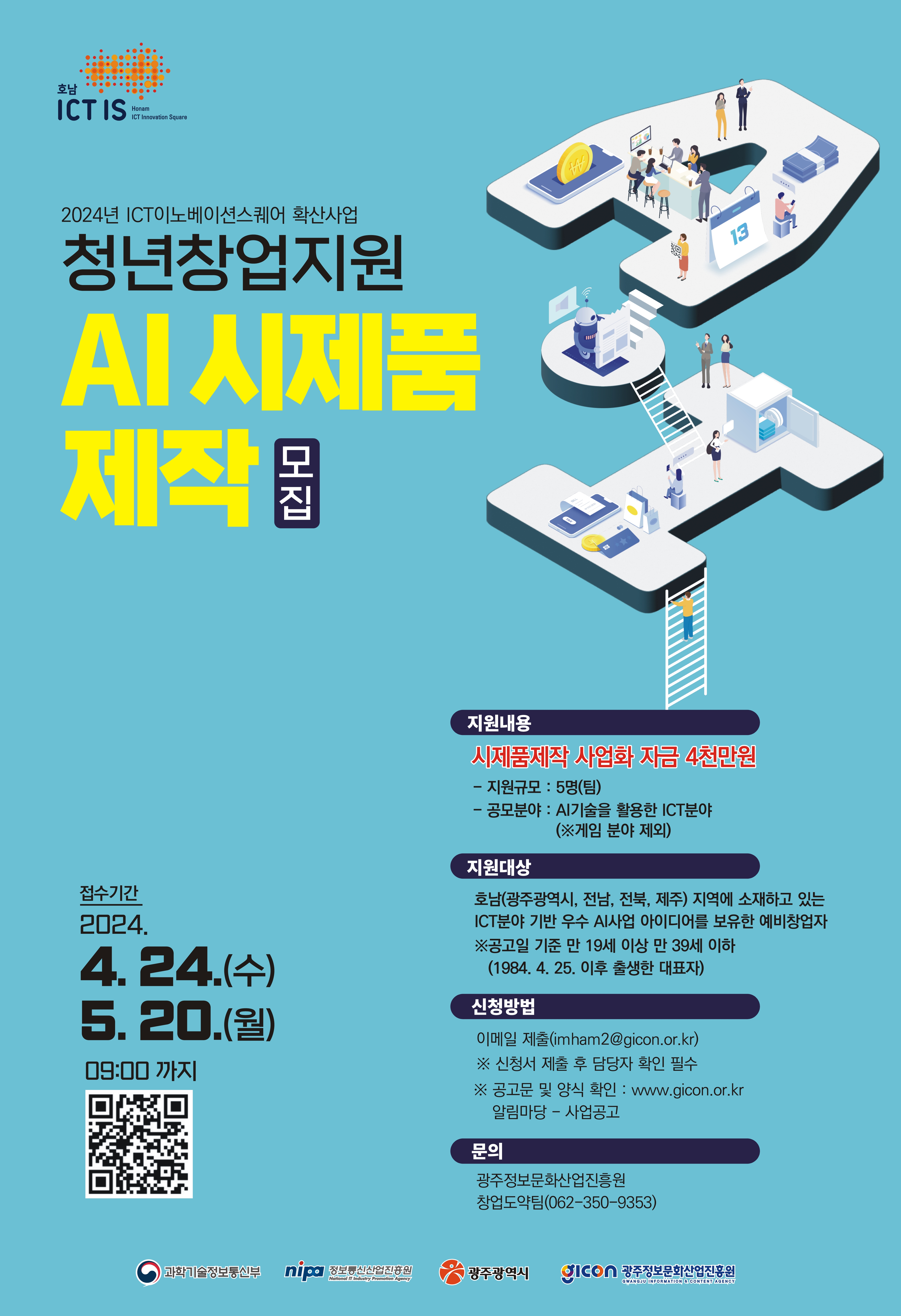 프로그램 신청 [호남] 청년창업지원 AI시제품 제작(예비창업자) 모집 공고 지원일정 2024-04-24 ~ 2024-05-20 프로그램 일정 장소 지역 구분 호남권 프로그램 구분 창업지원 정원 0 / 명 신청양식 Download 주요내용 호남 ICT이노베이션스퀘어 AI시제품제작지원 모집신청 클릭 ▶▷바로가기 ※ 유의사항 : 아래 신청하기 버튼이 아닌 이메일 접수!!! ○ 신청방법 : 이메일 접수(imham2@gicon.or.kr) ※ 접수 후 담당자 유선 확인 필수(062-350-9353) / 메일 누락 주의 ○ 신청방법 : 2024. 4. 24. (수) ~ 5. 20. (월) , 09:00까지 *마감시간 이후 접수는 별도 안내 없이 신청 무효 처리함 목록