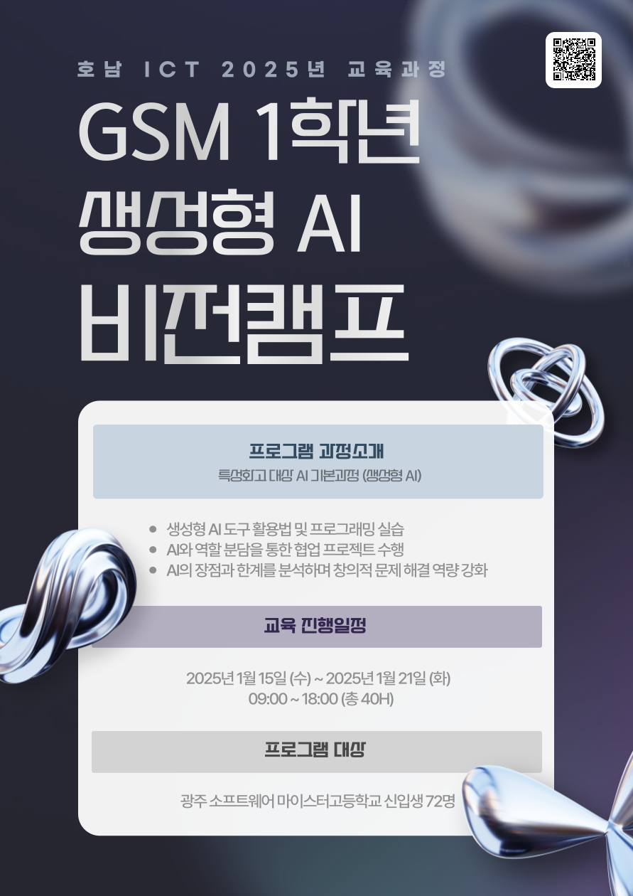 프로그램 신청 [광주] 특성화고 대상 AI 기본과정(생성형AI) 지원일정 신청 종료 프로그램 일정 2025-01-15 ~ 2025-01-21 장소 온·오프라인 지역 구분 광주 프로그램 구분 단기과정 정원 0 / 72명 신청양식 Download 주요내용 신청하기 목록