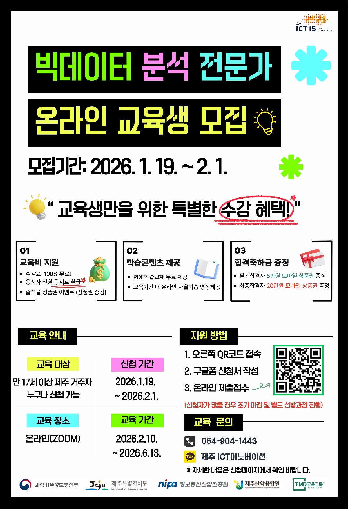 프로그램 신청 [제주] 빅데이터 분석 전문가 온라인 과정 지원일정 2026-01-19 ~ 2026-02-01 프로그램 일정 2026.01.19.~2026.02.01 장소 온라인 지역 구분 제주 프로그램 구분 중장기과정 정원 0 / 20명 신청양식 Download 주요내용 빅데이터 분석 전문가 온라인 과정 신청하기 목록